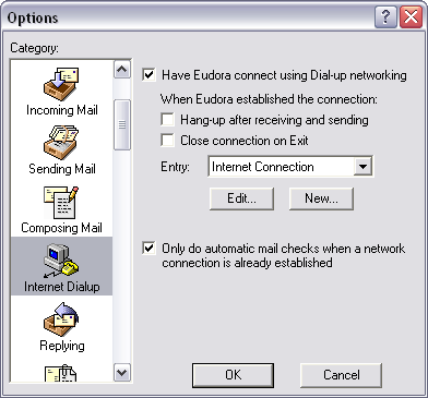 To do this, check the box Have Eudora connect using Dial-up networking.