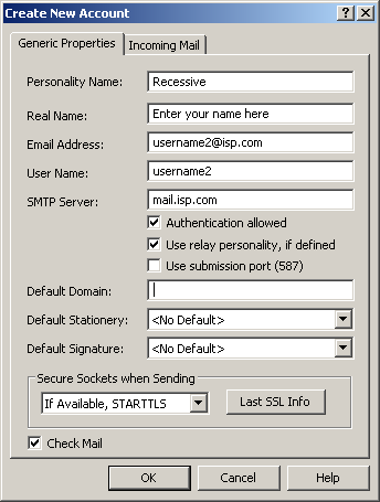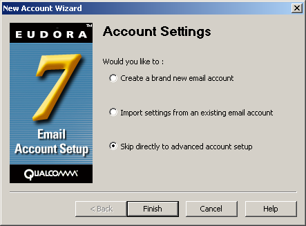 Below is a tutorial on setting up e-mail accounts. In Eudora, e-mail accounts are referred to as personalities. If you're a user with more than one e-mail account, Eudora can manage them for you. Just follow the screenshots below.