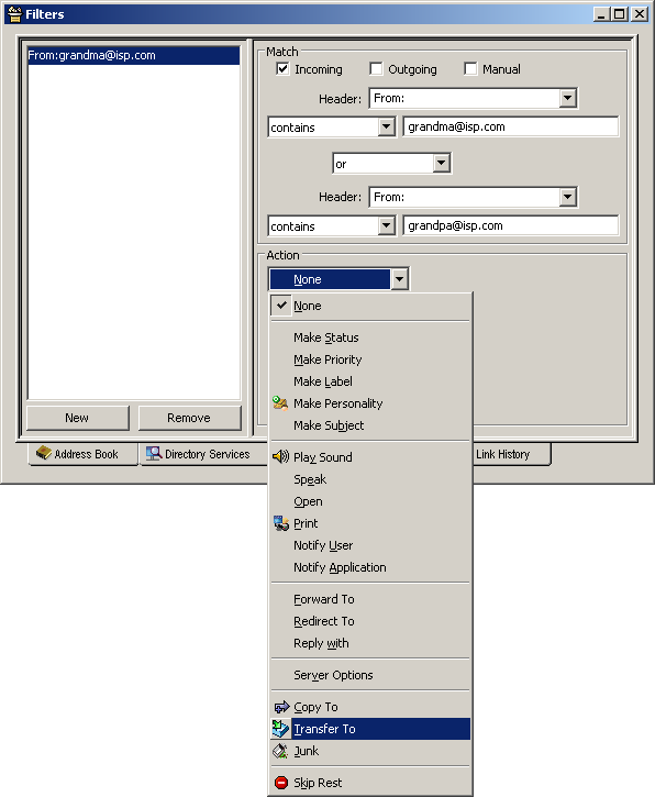 Now any e-mail that comes from the address you specified will be sent automatically to the folder you specify. In this example, any e-mail from 'grandma@ispname.com' will be sent to the 'Family' folder.