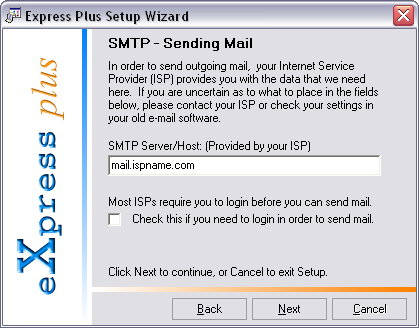 SMTP Server/Host = The Outgoing (SMTP) mail server usually follows this format: mail.ispname.com (or .net). Replace the "ispname.com (or .net)" with your ISP's name.