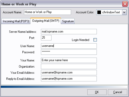 Server Name/address = The Outgoing (SMTP) mail server usually follows this format: mail.ispname.com (or .net). Replace the "ispname.com (or .net)" with your ISP's name.