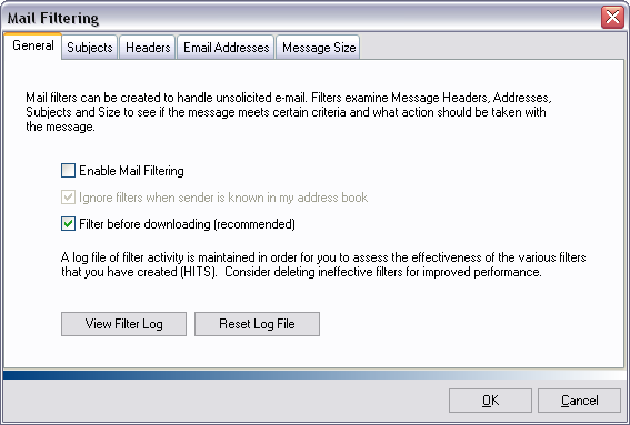 Click OK to exit the 'Mail Filtering' window.