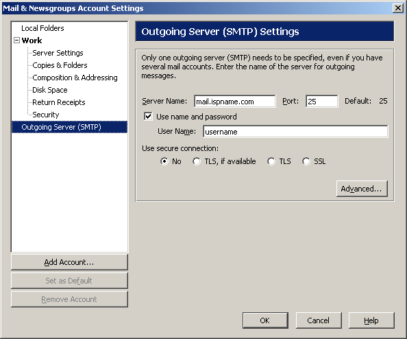 Server Name = The Outgoing (SMTP) mail server usually follows this format: mail.ispname.com (or .net). Replace the "ispname.com (or .net)" with your ISP's name.