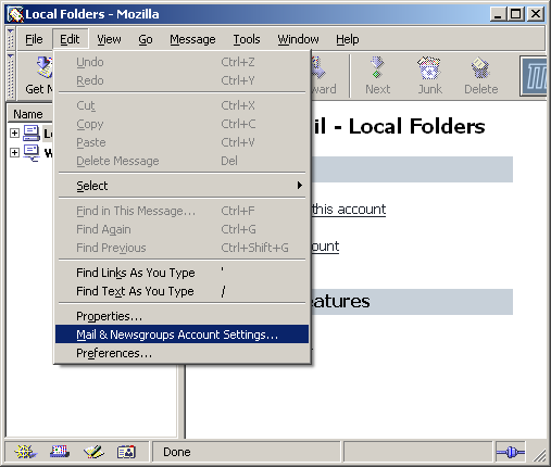 To edit e-mail accounts in Mozilla Mail, follow these steps:
