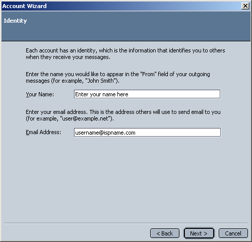 Account Name = Enter a name for the e-mail account. It doesn't matter what you call it, but it should be distinctive. This will help you distinguish it from any other e-mail accounts you create.