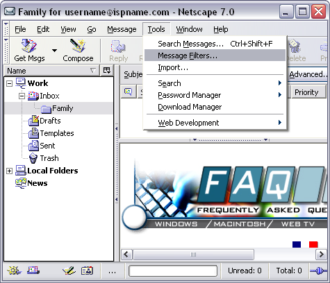 Filters are rules telling Netscape how to manage your e-mail. They are used in conjunction with folders. They can be used to send e-mail automatically to folders you create or eliminate e-mails you don't want. In this tutorial, we'll create a filter that sends a specific e-mail to the folder we created in the 'Folders' tutorial.
