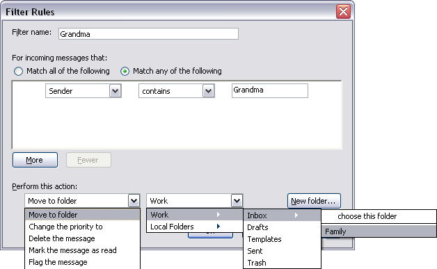 Now, any e-mail message that has the Sender field containing Grandma will be moved automatically to the Family folder.