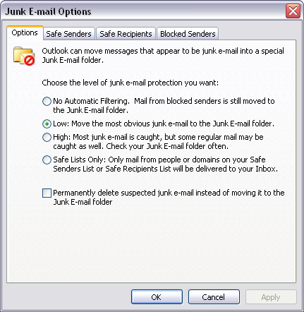 Here you can choose how Outlook 2003 handles spam. You can choose to automatically remove spam with different levels of security or not remove it at all.