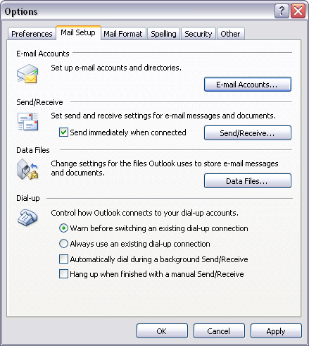 Note the four sections: E-mail Accounts, Send/Receive, Data Files, and Dial-up. We'll discuss the last.