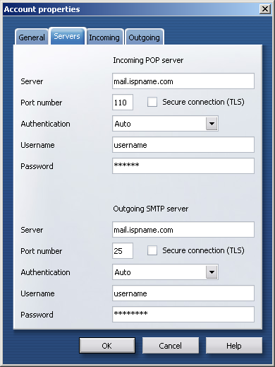 Note the two sections: Incoming POP server and Outgoing SMTP server.
