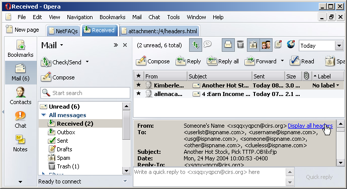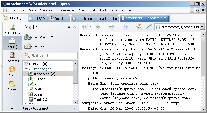 You can now view several more headers: Received, Recieved, Message Id, and path. These can help your Internet service provider decipher where the spam originated.