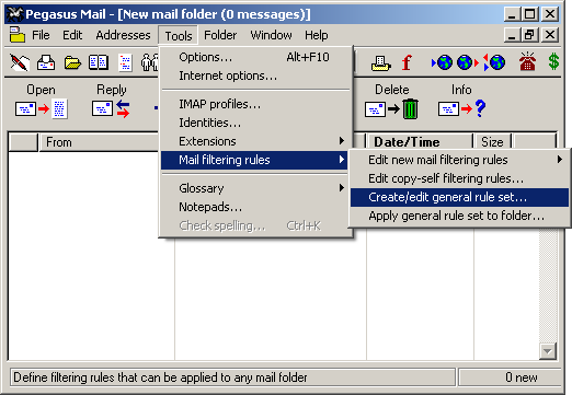 On the Toolbar, click Tools, select Mail filtering rules, and then Create/edit general rule set from the pop-out menu.