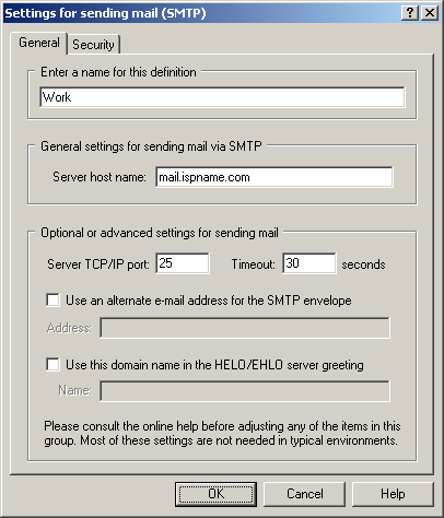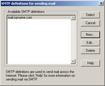 The SMTP definitions for sending mail window appears.
