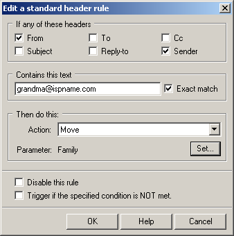 The new rule now appears in the list of rules. Any e-mail that "grandma@ispname.com" sends will be forwarded automatically to the "Family" folder.