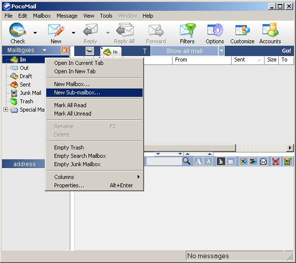 Under the Mailboxes column, right click the In mailbox and select New Sub-mailbox from the menu.