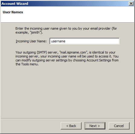 Incoming User Name = Enter the username to your e-mail address. The username is the first part of your e-mail address.