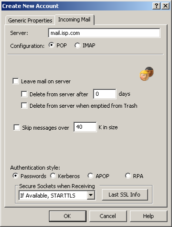 Server  =  The Incoming (POP3) mail server usually follows this format:  mail.ispname.com (or .net).  Replace the "ispname.com (or .net)" with your ISP's name.