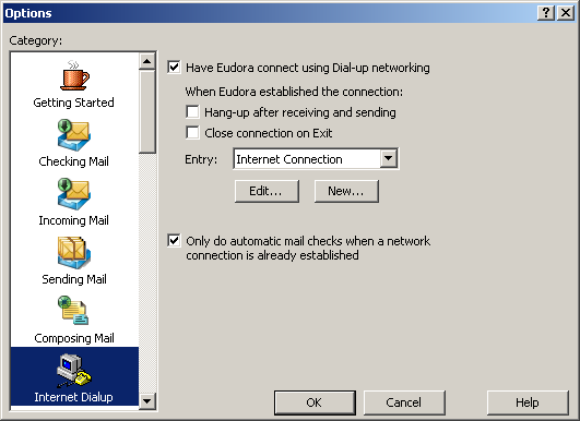 When enabled, Eudora can connect to the Internet automatically when launched. Eudora can also disconnect immediately after sending and receiving e-mail.