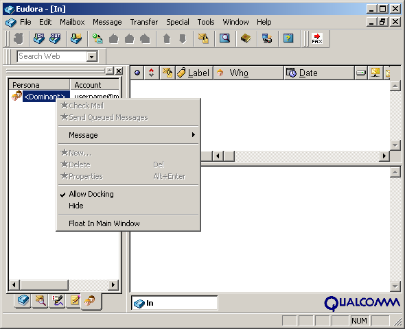 If you selected Lite Mode when you installed Eudora, you will not be able to access the dominant e-mail account's properties by right clicking in the Personalities window; the properties option is grayed out.  Eudora only allows one e-mail account in Light Mode and you can only access the properties through Options.  The following tutorial explains how to edit this mode.