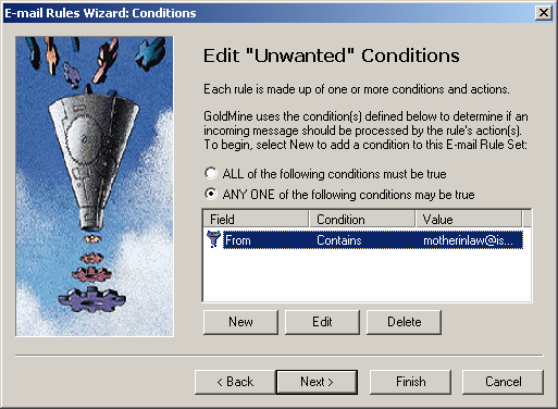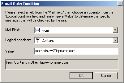 Now when an e-mail arrives where the From field contains motherinlaw@ispname.com, Goldmine will perform an action. We'll stipulate the action next.