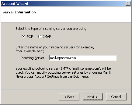 Incoming server = The Incoming (POP3) mail server usually follows this format: mail.ispname.com (or .net). Replace the "ispname.com (or .net)" with your ISP's name.