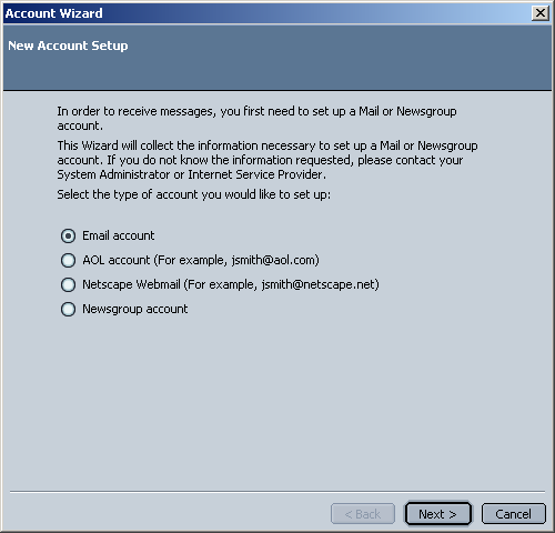 The first time you start Netscape Mail the Account Wizard launches to guide you through configuring an e-mail account.