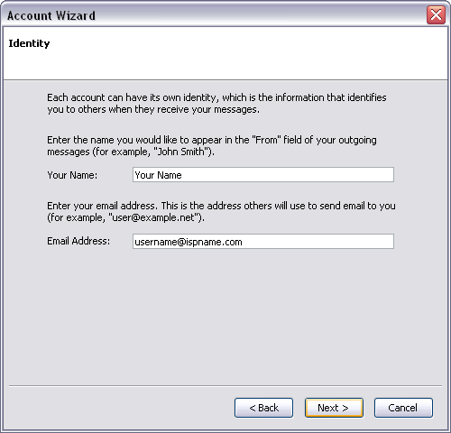 Account Name  =  Enter a name for the e-mail account.  It doesn't matter what you call it, but it should be distinctive.  This will help you distinguish it from any other e-mail accounts you create.