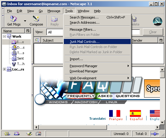 The latest version of Netscape Mail comes with built-in junk e-mail filters. Junk e-mail filters are a series of rules that detect whether an e-mail is spam or not. When enabled, these junk mail controls, along with any other filters you create, can reduce dramatically the amount of spam you have to endure. The following tutorial explains how to enable these controls.