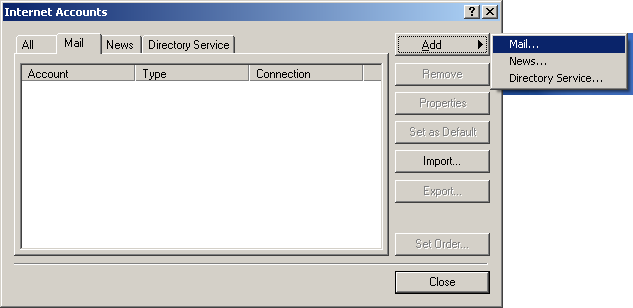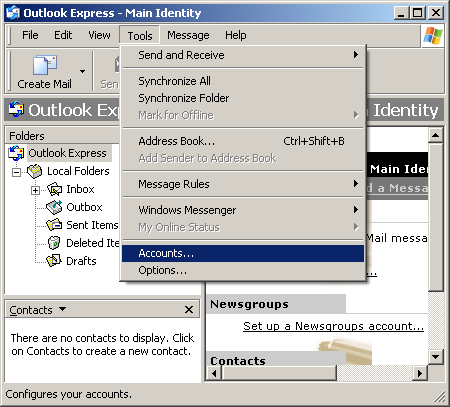 Note:  if you're opening Outlook Express for the first time, you will not see the window below.  You will see the Internet Connection Wizard.  Click here to jump to that step.