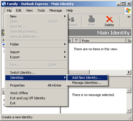 On the Toolbar, click File, select Identities and Add New Identity from the menus.
