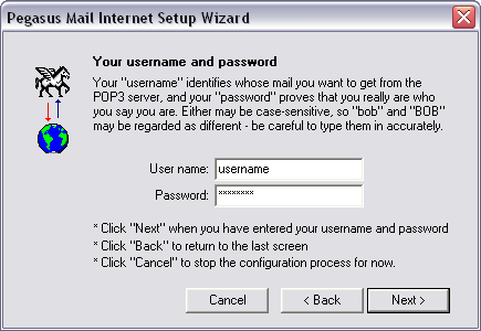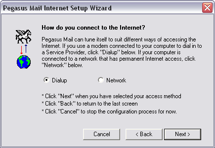 You can choose to have Pegasus dial up to the Internet to send/receive e-mail through your Internet connection.