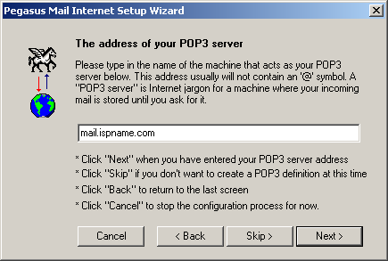 The address of your POP3 server = The Incoming (POP3) mail server usually follows this format: mail.ispname.com (or .net). Replace the "ispname.com (or .net)" with your ISP's name.