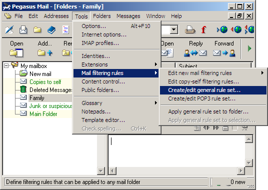 On the Toolbar, click Tools, select Mail filtering rules, and then Create/edit general rule set from the pop-out menu.