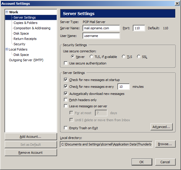 User Name = Enter your e-mail username (everything before the @). Port = This should be the default setting: 110.